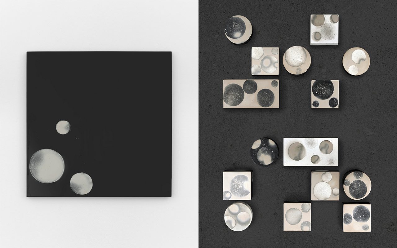 The exhibition moves fluidly between scales and media. Following the intensity of the pavilion, Pendleton offers a moment of intimate contemplation with “Untitled” (2026), a small black ceramic painting featuring three floating, silvery orbital forms that demand heightened perceptual awareness .