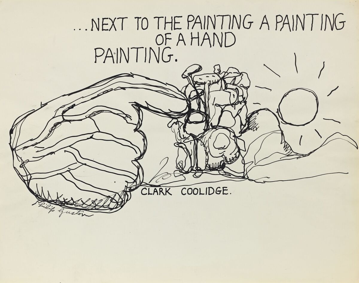 During his Woodstock years, Guston’s friendships with poets became central to his practice. Hauser & Wirth’s exhibition brings these “Poem-Pictures” into focus: drawings that converse with lines of poetry, chiefly by his wife Musa McKim and the poet Clark Coolidge. These works are not illustrations or captions; they are mutual provocations—image and text reading and reshaping one another across the page. Guston also collaborated with other poets, producing illustrations and covers for figures like William Corbett and Bill Berkson, and his cover for Coolidge’s “Ing” helped launch a decade of similar experiments with younger poets. These partnerships were integral, not incidental, to his evolving drawing language.