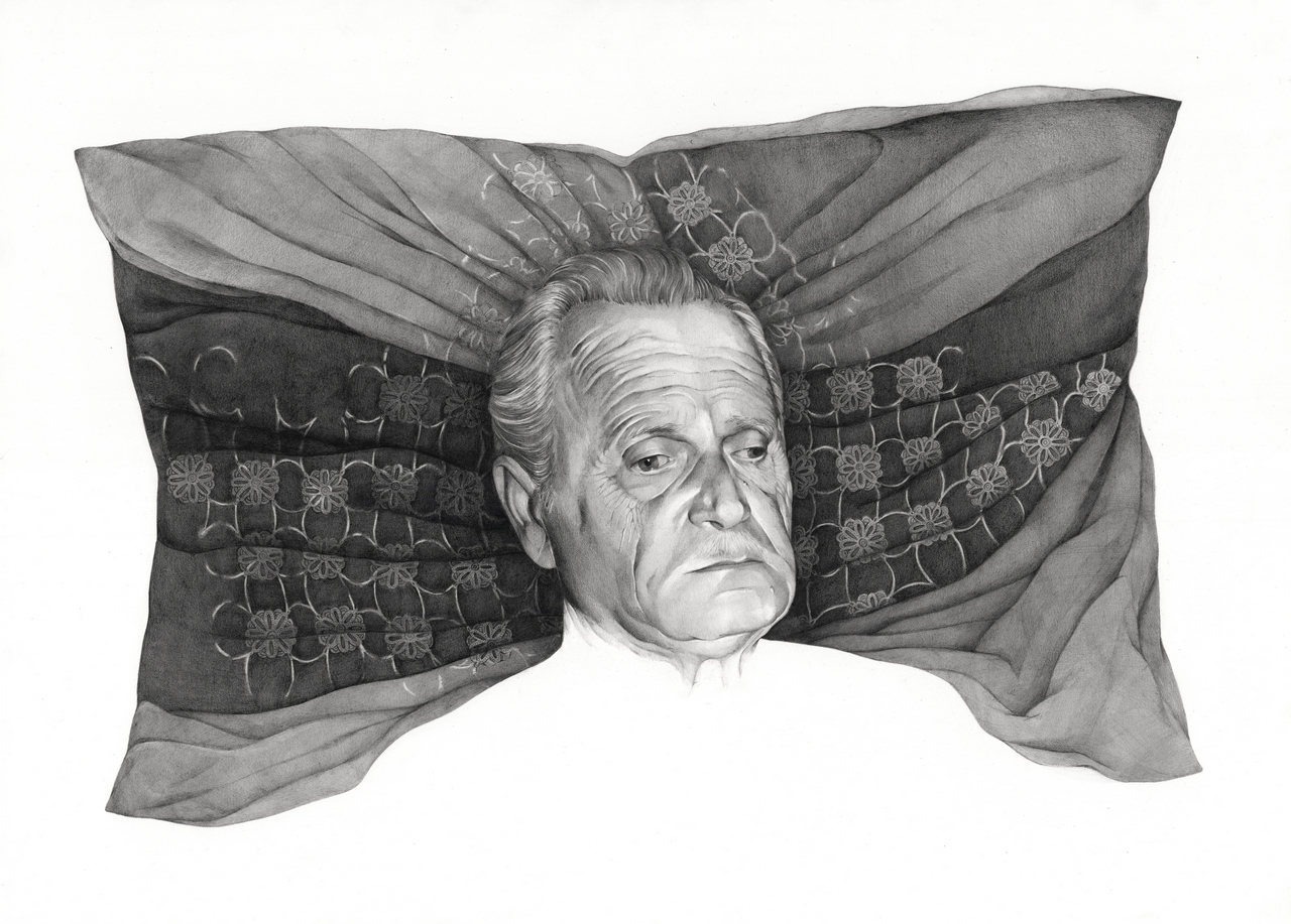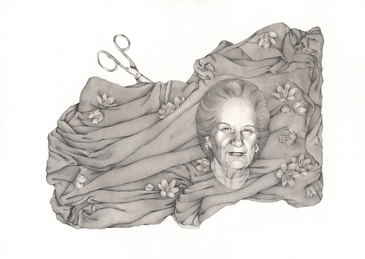 I could not distinguish between the works in this series, as each responds to personal moments. However, two pieces feel especially close to me: “Four Steps into the Past” and “Blossomed Memories”.“Four Steps into the Past” is the only work that includes all four of my grandparents. It gives me the feeling of entering a neoclassical building from another era, encountering patterned tiles reminiscent of my grandmother’s house. These motifs, despite any wear, remain timeless—just like the memory of these people. At some point, drawing was no longer enough. I felt the need to reconstruct the space in which my grandparents lived, to reassemble a setting where I could walk through their home again and encounter them as if in a lived memory. From this need emerged “Blossomed Memories”, and subsequently the sculptural works. The armchair, apart from its wooden base, is almost entirely made of Japanese paper and painted with pencil. It explores the boundaries of my materials.