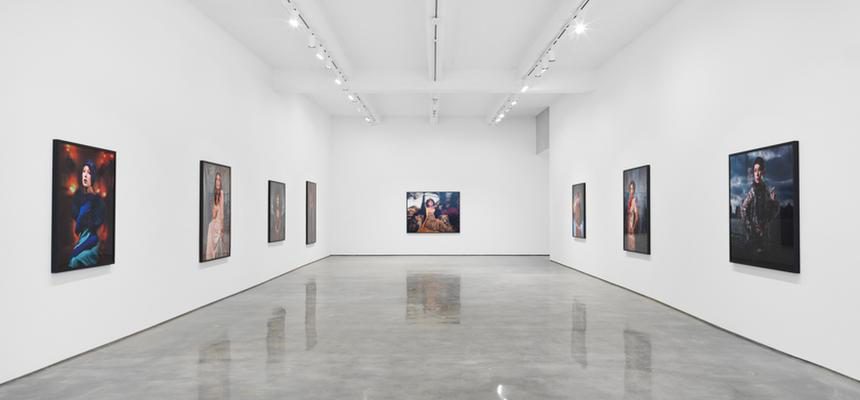 Cindy Sherman presents new photographs produced in 2016, her first new body of work since 2012 at Metro Pictures Gallery. As always to create her photographs, she assumes multiple roles of photographer, model, makeup artist, hairdresser, stylist, and wardrobe mistress. With an arsenal of wigs, costumes, makeup, prosthetics, and props, Sherman has deftly altered her physique and surroundings to create a myriad of intriguing tableaus and characters, from screen siren to clown to aging socialite. The exhibition presents 16 life-size, full-color portraits, Cindy Sherman adopts the personae of famous independent women from the Golden Age of cinema, the women are no longer young but they characterized by exaggerated makeup, modern clothing and seductive poses, like the ‘20s Hollywood publicity photos. In an interview she said about her new work “I’d been thinking about using makeup in a more extreme way, perhaps since the last two bodies of work (the Chanel series and the mural) didn’t involve any makeup at all, as I’d been tweaking the faces with Photoshop. As I was looking through a book about German Expressionist films and their stars, it all came together. Because of the extreme way actors made their faces up in those early day of film in order to pop out in the black-and-white. I just wanted to use makeup in the same way, partly perhaps because as women get older they’re told to wear less makeup. I loved the idea of doing the opposite”. The photos are shot before a green screen and then the backgrounds are digitally manipulated to allude to old film sets and backdrops. Taking further advantage of new technical options, each work is a dye sublimation printed directly onto metal, eliminating the need for glass protection and giving them an immediacy and sheen that has the paradoxical effect of bringing their subjects to life while simultaneously flattening them into a hyper-stylized netherworld.