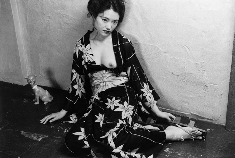After studying photography and film production at Chiba University, Nobuyishi Araki began his career as a commercial photographer at the advertising agency Dentsu. It was during the ‘70s that Araki rose to prominence as a fine art photographer. Publishing his first photobook in 1971 entitled “Sentimental Journey”, Araki then continued this project in 1991 with “Sentimental Journey/Winter Journey”. The original photobook documented his honeymoon with his wife, Yoko Araki, and the latter combines this with a visual record of her decline into a premature death. In 1974 Araki co-founded the Workshop School of Photography with other renowned Japanese photographers including Daido Moriyama and Shōmei Tōmatsu, and just two years later opened the Nobuyoshi Araki School. Since the early ‘70s, eroticism has been an essential element in Araki’s work. However it was from 1979 that Araki began his engagement with kinbaku, a form of Japanese bondage that has inspired much of his work since. Though provocative in nature, Araki claims that he “Frees the soul, tying the body” and in the other side “Since I cannot conquer the soul of a woman, I use the tying like a hung and the camera as a kiss”. Other pervasive themes include his flower series which, although not focusing on the exposed, nude female body like much of the rest of his practice, remain erotic through their specific rendering and positioning of the photographs, which recall both female and male genitalia. Nobuyoshi Araki’s works demonstrate a passion for vibrant colours and intense black and white photography. Inspired by Japanese traditions, both ancient and more modern, Araki’s influences include the Japanese art of Shunga, which reached its apex in the Edo period with infamous artists such as Katsushika Hokusai, as well as more unconventional signifiers of Japanese culture such as Godzilla-esque monsters, and modern Tokyo culture. Araki’s models also often wear the traditional Japanese kimono. In the photographer’s work, this traditional Japanese dress is intriguingly juxtaposed against the erotic posing of the models who wear them. These photographs are intimate depictions of sensuous subjects, as well as a documentation of everyday life in modern Japan. Most dates that appear in his photos are: April 1st as a reminder that the photographer is a liar, 6th, 7th and 15th August days where the atomic bomb was dropped on Nagasaki, Hiroshima and Japan surrendered during World War II, while after 2009 uses dates between 6 and 15 August paralleling the atomic bombs and the surrender of Japan with his surgery for prostate cancer and his treatment with radiation.