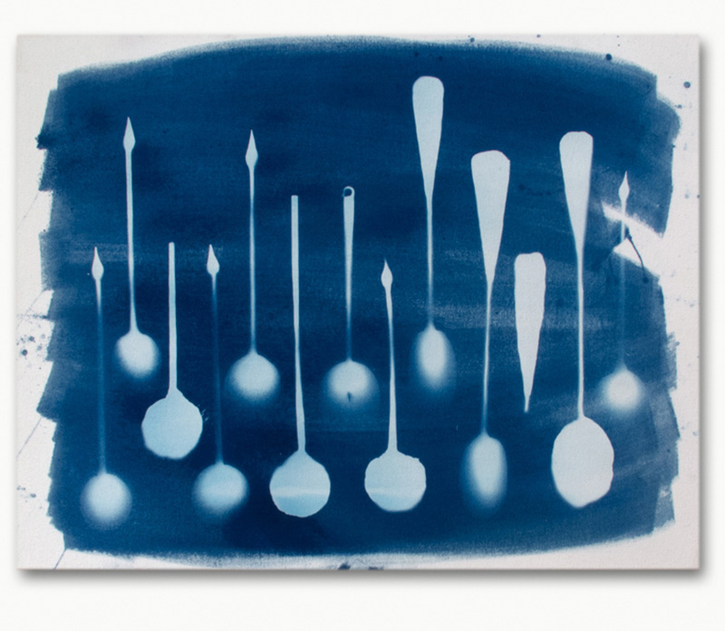 The aroma lingered and held onto the inside of the bottle as long as it could. Eventually it would detach the scent fulfilling its ephemeral fate, while the ornamental glass receptacle endured. The reflective label triggers that particular scent, as would the shadow cast on the wall when the light would meet the bottle’s profile in the late afternoon. Gabriele Beveridge collects faded hair salon posters and beauty shop ads. She seeks out doubles, skewing or cropping these found images that are paired with photograms and adorned with artist made frames, hand blown glass elements and crystal balls to explore tropes of eternity, ephemera, beauty, and mystique. Andy Coolquitt is a quintessential collector of refuse, consistently repurposing the dirty everyday into display patterns and vitrines. Here, Coolquitt’s vitrines present washed up deodorant sticks, their surfaces, naturally roughened by the passage of time, appear as if cast in stone or marble. These indexes of irredeemable materials are, ironically, now (and forever), re-categorised as art. In Owen Kydd’s photographs, objects on display are endlessly looped to a nearly Lynchian effect of perpetual unease and fascination. Her positioning of the screen as art object also draws equivalence between his media and the things he pictures, between the constancy of photography and the dynamism of video. Kate Steciw suspends fractured and re-purposed stock imagery in her mobile-esque photographic sculptures. The seemingly random assemblages speak directly to the mass consumption and rapid digestion of images. Steciw halts this process, as she suspends the images in free fall. Moreover, new collaborative work with Anne Hall centers on the cyanotype, creating permanence in these imprints of simple objects.