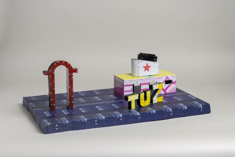 Since the 1990s, Antonio Cosentino has been interested in the subculture and architectural developments; the uncanny destructions and the metamorphosis of the city of Istanbul. Many of Cosentino’s works look at historical events from a humorous perspective to create fictitious arrangements that fold different stories back on one another. Dazzling arrays of techniques contain larger political, historical and philosophical questions. Influenced by the history of Berlin as a divided city, the artist imagines a wall erected in one night in the city of Istanbul, In his speculative fiction story “Summer Was a Beautiful Day”, not only words but also objects, installations, drawings, paintings and a map merge to tell the narrative in chapters. Maps, urban models and small objects such as tin toys, soda bottle caps, albums that Cosentino collected during his residency at Zilberman Gallery Berlin’s artist-in-residence program in the summer of 2017, become the tools of storytelling for the narrator-protagonist. The collected material, with the influence of the story, turned into artworks such as the tin 3D model “Tuz” (2017) that reminds a ship or the charcoal drawing “Hiro” (2017). The artist references the micro ecosystems of city life by using recycled materials within his work, and in particular tin, which carries both an economic and cultural significance at the periphery of Istanbul.