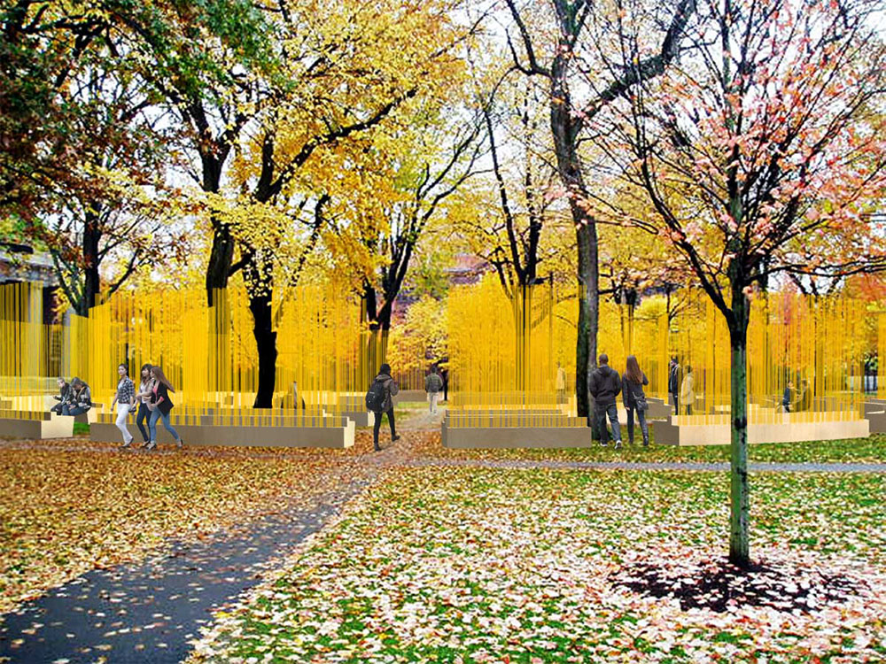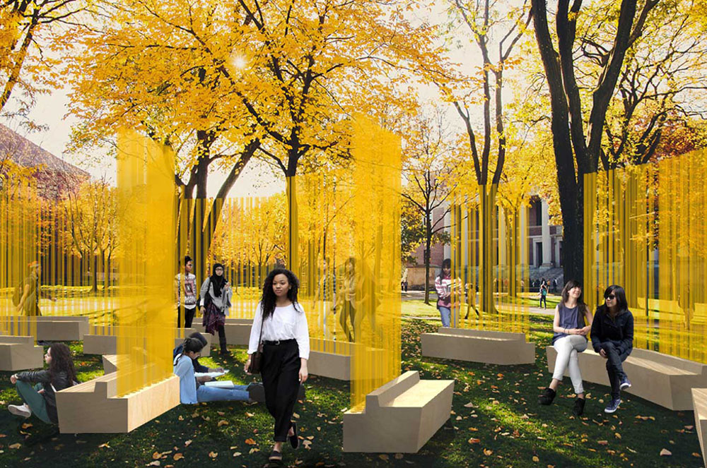 “Autumn (…Nothing Personal)” is a public sculpture by the artist Teresita Fernández, commissioned by the Harvard University Committee on the Arts, the installation is both a physical site and a space for public dialogue and performance. The project transforms an area on Harvard’s campus that is normally a place of transit into a space for public dialogue and discussion, gatherings, and performance. Teresita Fernández set out to “Make a work that was almost camouflaged by the changing colors of autumn in the Yard. While the piece does not change or move, everything around it is in constant flux–leaves turning colors and falling, passers-by animating the scene, activating the work and site with performances and simple gestures of being in the space”. The project is in part inspired by American novelist and social critic James Baldwin’s text “Nothing Personal” (1964), at the height of the civil rights movement. Baldwin’s essay, originally produced alongside images by Richard Avedon, explores the complexities and contradictions at the center of the American experience and offers a critique of a society that is disconnected, unjust, divisive, and violent through his personal reflections and perspectives. Yet Baldwin ends his work speaking of love, light, and trust. “It is this conjunction that inspired my use of the vulnerable light of autumn as a metaphor for a nation still struggling so desperately with the same issues Baldwin so eloquently exposes” explains Fernández. “Autumn (…Nothing Personal)” will feature dozens of collaborations, including public events led by organizations on campus such as Harvard’s Committee on Ethnicity, Migration, Rights, Harvard University Native American Program, Harvard Art Museums, American Repertory Theater (A.R.T.), and experimental performances by artists such as Josefina Báez, Jill Johnson, and Claire Chase. Volunteers are encouraged to read the Baldwin essay, lead a group discussion, or propose their own public performance as part of the installation throughout the month of September. Sign up online to join a group reading.