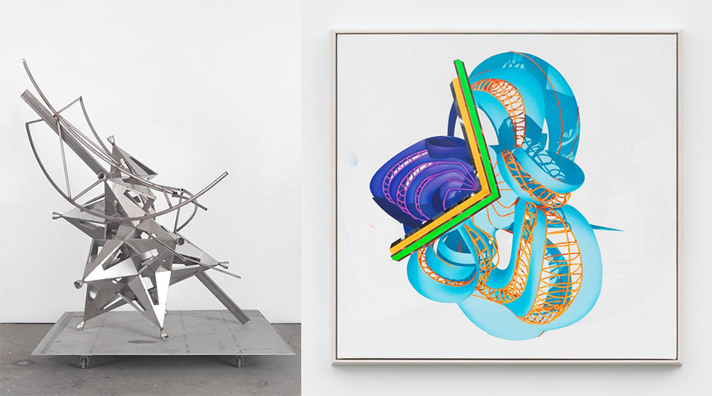 The selection of works by Frank Stella that are on presentation at his solo exhibition “Recent works” at Sprüth Magers in Los Angeles highlights the artist’s ongoing experimentation with spatial representation and includes the début of a new painting series. Frank Stella’s recent work offers viewers a remarkable and confounding visual experience. Since the 1990s, the artist has worked with computer renderings of complex forms, piecing together compositions from recurring motifs inspired by smoke rings, a spiral-coiled hat, stars, and other visual phenomena. Though Stella conceives of all his works in relation to painting, they often extend into three dimensions and are inspired by various disciplines, including literature, philosophy, and music. “The Broken Jug. A Comedy [D#3] (left handed version)” (2007) takes its title from the German Romanticist writer and theorist, Heinrich von Kleist, whose texts Stella has engaged with for twenty years. Ribbons of wood weave in and out of each other in graceful arcs, flowing dynamically over viewers as they walk around the piece. Three additional sculptures illustrate the artist’s diverse approaches to the star form, which has figured prominently in his work since 2014. Stella’s stars at times appear weightless, dissolving into bands of stainless steel; elsewhere, their mass is tangible and echoes the weighty reality of celestial bodies. “Summer Star (Net)” (2015), moreover, exhibits the process of rapid prototyping (RPT) that the artist has used for many years to develop intricate arrangements of vibrantly colored plastics and metals. The title, and original source of inspiration “Scarlatti K” series that began in 2006, is far from contemporary. Stella took the name from the 18th Century baroque composer Giuseppe Domenico Scarlatti and the 20th Century American musicologist Ralph Kirkpatrick who catalogued Scarlatti’s harpsichord sonatas chronologically giving each one a “K” number. Rather than attempting a literal translation of Scarlatti’s compositions, Stella’s series instead evokes the “sense of rhythm and movement that you get in music” as the artist says. In “K.404” (2013), for example, a spray of yellow needle-like protrusions suggests staccato notes and an upbeat tempo, and metal parabolas trace meandering melodic lines. On view for the first time, Stella’s recent paintings mark the artist’s return to the canvas, with compositions that relate directly to his three-dimensional investigations. Each one features a painstakingly rendered, undulating form that hovers in space, casting painted shadows onto the picture plane below. With the look of architectural plans, computerized models, and diagrams, the figures seem to defy gravity, as if designed for some otherworldly location or enigmatic purpose. Sensuous and inviting, these new works offer insight into Stella’s long-standing conception of painting as a multidimensional, multidisciplinary enterprise.