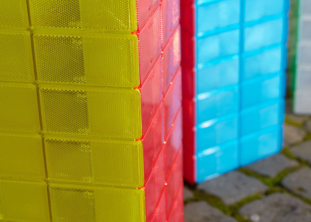Comprised entirely of reflectors, Rana Begun’s latest body of work, that is on presentation in her solo exhibition “Perception and Reflection” at The Third Line Gallery, captures the unexpected geometries of urban environments while light continues to hold sway over the works’ formal aspects. The exhibition takes its cues from Rana’s 2006 British Council residency in Bangkok, where she first experimented with reflectors as a medium for creative expression. Interested in readymade materials for their ability to translate abstract ideas into tangible forms, Rana returned to reflectors a decade later with a 50-meter long work installed at Lewis Cubitt Square in London’s King’s Cross in 2016. Fast forward a couple of years and scale down a couple of feet, Rana’s new reflector works describe our ever-evolving built environment. Inspired by the straightforward patterns and vibrant colors of roadsigns and the way in which their surfaces shift as the day progresses, these works too shift and change as light exposure varies and as viewers walk around them. Complementing Rana’ wall-based pieces are towering structures that echo Dubai’s vibrant cityscape. Akin to our urban environments, Rana’s new body of work reveals a world of contrasts: the reflectors’ static nature yet perpetual movement; the preciousness of an artwork and the simplicity of quotidian materials; the clear delineation of each work yet the sense of infinity its constitutive elements and repetitive patterns conjure. Beyond such dichotomies, what Rana’s works succeed to orchestrate is the contemplative nature of urban chance encounters. Light, or more precisely, natural light, is perhaps Begum’s most precious material and also fundamental to the showing of her work. Although her works appear candy-like, with a faultless sheen, in photographs, Begum is weary of the transition from object to image, “I really don’t like images when people have to look at my photographs to understand the work. I find that really difficult because most of my work is about experiencing it and seeing it react with the light”. For something that can depend so much on circumstance, Begum is undeterred, because it is up to the materials she assembles onto the plane to carry the complex composition of light. She adds, “I look at the space, I look at the architecture and I look at the way that light enters it and how I can use this to my advantage. I think a lot of my work is not fighting with architecture, but instead, working with it”. As a self-proclaimed student of the minimalists, their trace is certainly visible in Begum’s work. Her primary occupations are with the assembly of light, form and the viewer’s field of vision, for which she cites Agnes Martin, Sol LeWitt and Donald Judd as formative influences.
