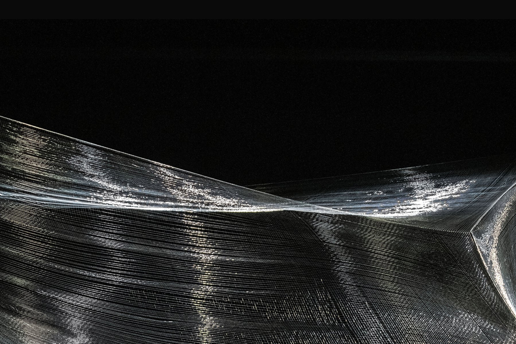 Studio Drift’s solo exhibition at Pace Gallery, features a single large-scale sculpture titled “Ego”. The work, taking the form of a shapeshifting block, is composed of hair-thin black nylon and handwoven in the Netherlands by DRIFT themselves. Tailored to the seventh-floor space, the work transforms the gallery into a thought-provoking environment in constant flux. It will be accompanied by a Pace Live event with musician and singer-songwriter Lee Ranaldo, of Sonic Youth, on 12/3 at 19:00. “Ego” is a massive woven block, made of more than 16km of hair-thin Japanese fluorocarbon, controlled by motors, allowing the artists to animate and choreograph it. There has never been a block this size woven before, therefore the artists created their own weaving loom. Softwares and algorithms were developed, allowing the artists to animate and choreograph it as puppeteers. The intricate network of threads collectively rises, falls, expands and contracts, transforming between natural and non-natural states that recall synthetic structures as well as the micro-organisms and material substance that make up all life. As the form softly moves through the air like a spider web in nature, its black nylon threads come together and apart, emerging into and out of vision to create a perceptual phenomenon that reflects the internal structures of things unseen. “Ego” was originally developed in co-production with the Dutch Travel Opera house (Nederlandse Reisopera) for Claudio Monteverdi’s Opera “L’Orfeo” (1608), which premiered in January 2020. The world’s oldest-known opera, it tells the story Orfeo, whose reality unravels at the death of his wife Euridice. DRIFT’s work moved and shifted based on the themes of the play, particularly of Orfeo’s inner state, drawing parallels to the human condition as a whole. Together with director Monique Wagemakers and choreographer Nanine Linning, DRIFT transformed the opera into a technological cutting-edge total work of art. The block shape of “Ego” is a motif the artists have explored over the last decade, particularly in works such as their “Materialism” series, in which they reduced objects, such as a bicycle, down to their distinct materials and arranged them in minimalist compositions and “Drifter” (2017 an installation consisting of one floating concrete block (4 x 2 x 2 meters). The sculpture floats and moves at slow speed on a controlled three-dimensional path. With great accuracy, it creates a performance in its space.This concrete monolith represents a basic building unit, the primary element by which human built environment is constructed. On its own the concrete block is nothing, lost in space and time without reference to anything; it is always searching to be part of something bigger. “Drifter” wants to make people feel that without context they are lost. Without context, the object feels alien, divorced from its source. Moreover, Drifter shows how unknown the world and its mechanisms still are to mankind and emphasises the urge to expand our horizon and evolve in time. “Drifter” also refers to Thomas More’s book “Utopia” (1516). This novel mentioned concrete for the first time. Back then, concrete was ‘just’ a science fiction idea which centuries later became the foundation of our society.