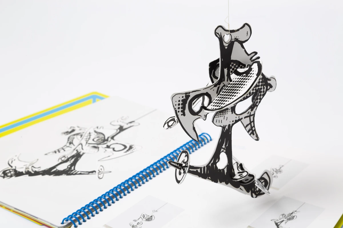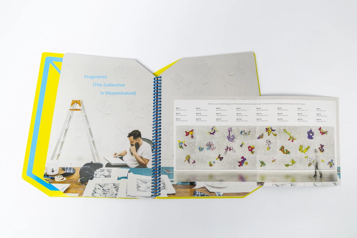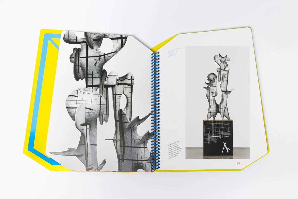 Aaron Curry makes sculptures and paintings whose relationship to modernism is productively fraught. Incorporating a wealth of elements from popular culture––science fiction, video games, cartoons. Curry has developed a body of work that is both a recognizable continuation of art historical narratives and a caustic, critical, and often hilarious take on the established order. In recent years he has produced a group of large-scale aluminum sculptures that upend the classical poise of Alexander Calder, foregrounding instead a surreal biomorphism and seemingly improvised compositional flair. These objects translate the hands-on immediacy of his earliest sculptures at a municipal scale, emphasizing the democratic fervor that animates his project. An ongoing collage of the lineages of Disney, Picasso, and Chicago Imagism, Curry’s work provides a funhouse-mirror vision of the future of the Western tradition. The catalogue “Aaron Curry: Fragments from a Collective Unity” by STPI Gallery, published on the occasion of his first major solo exhibition in Southeast Asia. From his suspended “Grid-Trip Cluster” paper sculptures to the free-standing “Ghost Bone” series, Curry transformed the gallery into a starburst of fluorescent patterns and constellations which transport visitors into the ‘lost realm’ between the two- and three- dimensional. Characterised by saturated neon colors and evocative organic shapes, the biomorphic sculptural works, inspired by a myriad of art movements such as cubism and surrealism, are effortless drawings in space. Illusions of depth are created through offhand shading and crosshatch strokes and juxtaposed with blunt outlines and solid colors. Through this, Curry masterfully merges the experience of surface and dimensionality in a visually stimulating tango.-Efi Michalarou