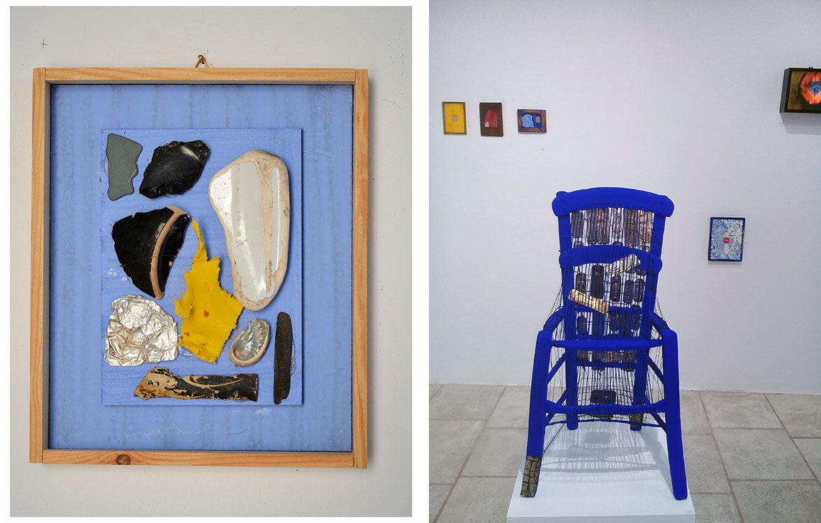The works of the exhibition “Two Doors, Two Windows”, are different and similar at the same time. Artworks that have inherent affinities. Artworks that coexist and converse harmoniously, giving the viewer the impression that they were created to coexist, because the conceptual axis that joins them, is that both artists (Lizzie Calligas and Leda Papaconstantinou) narrated each, on her side, their truth, faithfully respecting the aesthetic and conceptual course. While the means of expression they use are many and varied (painting, video, photography, collage, installations and sculptures), something which could be dangerous and one would think that these are two small individual solo exhibitions, since each artist exhibits more than 15 artworks, however, austerity, minimalism, artistic experience and their common visual vocabulary form gradually a top level exhibition. An exhibition that is contemporary and timeless at the same time since it includes the course of each artist. “Through this exhibition, I saw my twenty years course” revealed to us Lizzie Calligas. The exhibition is fragile and solid at the same time, where the dividing lines had been removed and the artworks had been unified without losing their identity and personal seal, since Leda Papakonstantinou’s scope was “To maintain a common aesthetic in every artwork”, something she did with great success, since if someone looks at her works, all undated, he/she has the feeling that they were created just now (!) And as the art historian Denis Zacharopoulos characteristically writes in the Prologue of the Catalog “In a nutshell, we all know that Lizzie Calligas and Leda Papaconstantinou, each in her own way, are Spetsiots, by history as well as by choice. They are old and dear friends, important artists who, through their multifaceted personalities, share their differences and the multiple manifestations of their art, their lives, their island, society and their place in the world”.