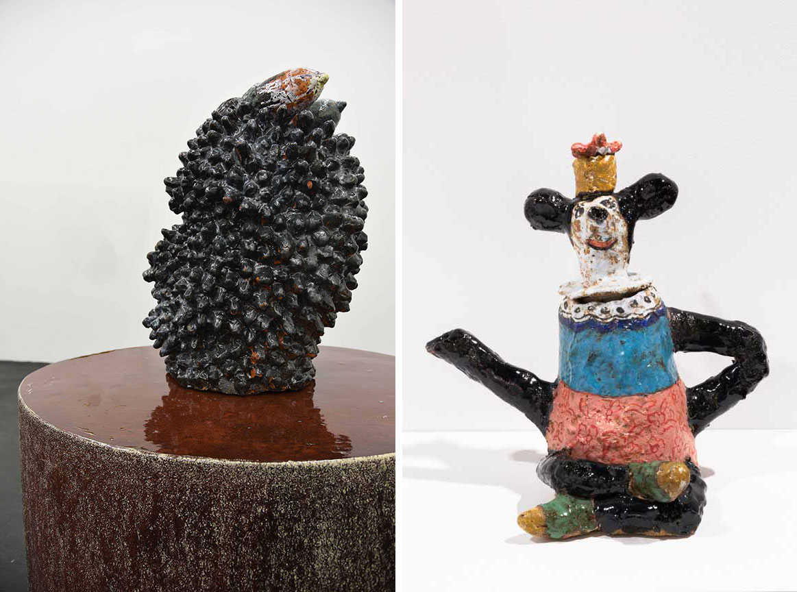 The curator of the exhibition “Artifices instables, Stories of ceramics”, chose to investigate ceramics as a heterogenic and unstable material, able to tell transversal stories. Through a selection of more than 120 pieces by international artists, the curator envisioned a set-up which is a crossover between atelier and a cabinet of curiosities. The whole space has been planned with the help of Swiss designer Adrien Rovero who conceived the tables where some of the are exposed, and Cypriot designer Michael Anastassiades for the lighting, with his lamps produced by Flos. The exhibition path involves both floors of Villa Sauber, and the works are displayed following the idea of affinity and visual references. The «fabrique de Poteries Artistiques de Monaco» (Monte-Carlo’s Artistic Potteries factory), begins its activity in 1874 inspired by the Arts & Crafts movement, enhancing the production of ceramic pieces enriched with very colourful floral and animal decorations, referring to the local plants like lemon and grape, often depicted in enamelled braided straw baskets. In the same period, in the American state of Mississippi, George Ohr, « the mad ceramist of Biloxi », started the production of his “magic pieces”, deconstructing « enamelled abstract vase » and experimenting for more than thirty years with numerous shapes as well as with production processes and assemblages. Ohr is considered today one of the pioneers of American Modern Art. The second stage of the Poterie de Monaco (1907-1914) is represented by Eugène Baudin, who moved in the region in 1906, and his works which anticipate Surrealism. Also deeply connected with the heritage of the territory, the pieces by Albert Diato. He discovered the potential of this practice at the Madoura atelier in Vallauris and gave a substantial contribution to the aesthetic revolution of ceramics in the 1950s. The presentation of Pablo Picasso’s assemblages in ceramics opens new perspectives in the field of Western contemporary creations, proposing new stories of unstable artifices. Chiara Camoni and Simone Fattal give life to mythological and archetypical creatures, while Magdalena Suarez Frimkess, jostling with codes, renews the tradition of American pottery giving it a new function connected with social and political claims. Ron Nagle, pupil of Peter Voulkos, abandons the stereotypes of his time with pieces inspired by the landscapes and the architectural details of San Franciso, by the Japanese culture (the ikebana and the tea ceremony), and by the work of Giorgio Morandi. The idea of experimentation is fully represented by Brian Rochefort. The apparent magmatic disorder of his pieces hides a real technical prowess which allows enamel and clay to hybridize, breaking and meticulously recomposing eruptions of textures. Aaron Angell proposes “assemblages” of maquettes, which the artist himself defines psychedelic while continuously exploring new ways of working with particular stonewares and glazes that he creates himself. Finally, the subversive observer Johan Creten who rewrites with clay the art of metamorphosis. The totemic power of his works is highlighted by their titles, usually very evocative. This plastic research, thoughtful or hazardous, and these unstable transmutations, always confer a symbolic value to the earth. Malleable medium, it will only reach an unalterable state after cooking. Become ceramic, it will always preserve, through its metamorphoses and the inventions which its creators subjected to it, the memory of its artificiality and its chromatic alterations.