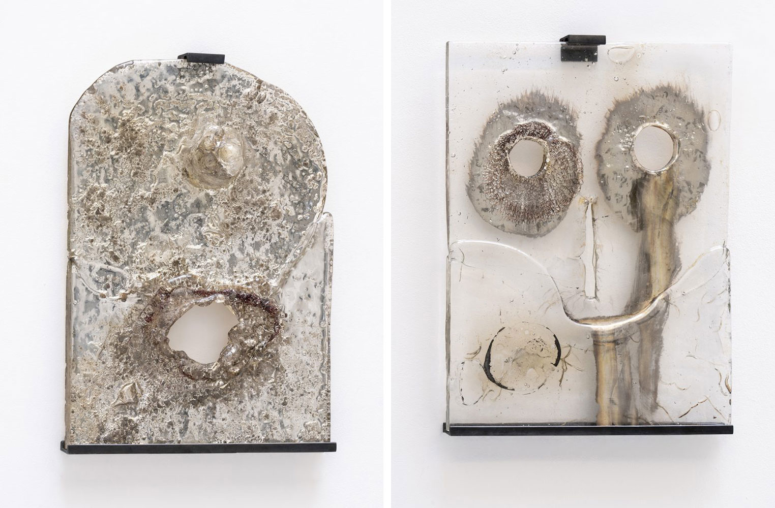 Photo Left: A.K. Burns, When It Leaks It Pours, 2019, glass, silver nitrate, copper mesh, , hanging support created by the artist 19.29 x 13.78 x 0.79 inches, © A.K. Burns, Courtesy the artist and Michel Rein Galerie. Right: A.K. Burns The Cry, 2019, glass, silver nitrate, copper mesh, carbon, , hanging support created by the artist 20.08 x 15.35 x 0.79 inches, © A.K. Burns, Courtesy the artist and Michel Rein Galerie