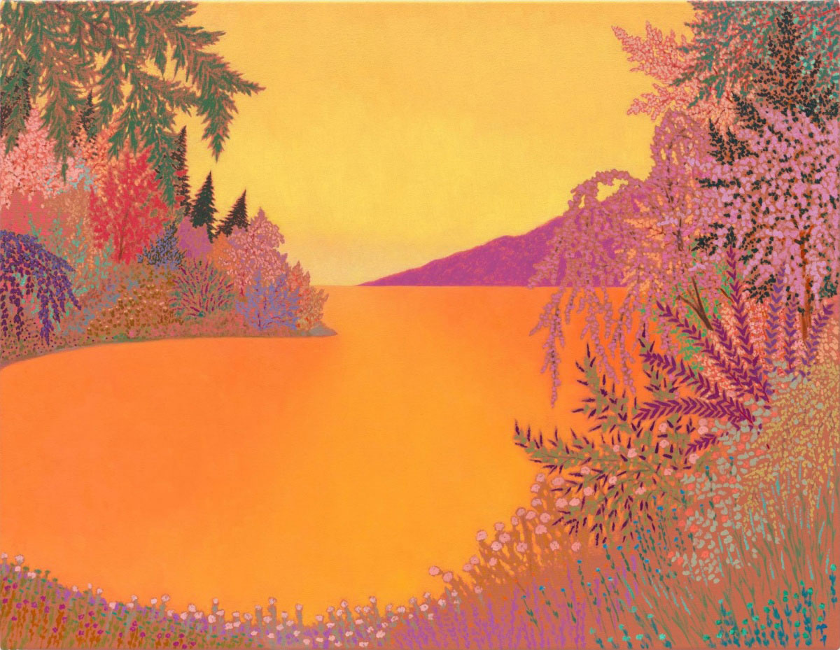The exhibition “Be Delirious Reveries Ringing” brings together over 30 paintings in oil on canvas of visionary landscapes, inspired by the foothills of the Berkshire Mountains in Western Massachusetts where John McAllister lives and works. McAllister seeks to represent – or rather recreate – moments of rapture that he encounters in nature. He intends the exhibition’s title as a command, as well as a testament to his own experience. His paintings offer abundant opportunities for delirious revery, even while exaggerating the conditions one might find in nature to unnatural extremes. McAllister rarely, if ever, paints from reference photographs. This might be surprising to followers of his work familiar with the paintings for which he first became known: scenes that incorporated pictures within pictures; landscapes framed by doors and windows; interiors framed by decorative borders. Those works foregrounded their pictoriality, not as a means to preclude absorption or rapture, but to enhance it. In these new paintings – and indeed most of his work made in the past three years –McAllister dispenses with the compositional quotation marks of his earlier pictures. They are vehicles for ecstatic absorption, no matter their or their format. The artist continues his exploration of tondos and cartouches, shaped canvases that replicate the human field of vision and which reveal the conventional rectangular picture plane to be as much a stylistic contrivance as a circle or an oval. McAllister has long been influenced by modernist artists such as Bonnard, Vuillard and Matisse, who incorporated pattern and decoration into their paintings, as well as precedents such as the British Arts and Crafts movement, and the Transcendentalist writers and philosophers who established themselves in Massachusetts in the mid-19th century. None of those artists ever considered artifice and aesthetic contrivance to be incompatible with profound spiritual reflection or transcendence. He acknowledges that when immersed in even the most spectacular landscapes, it is impossible for him not also to be thinking about every landscape painting he’s ever looked at, not to mention every landscape photograph he’s seen, every film he’s ever watched or book he’s read. There is nothing inherently wondrous about a vista of land and sky; landscape is a cultural construction. For centuries, untamed wilderness was regarded as either threatening, foreboding, boring, unholy or just plain ugly. It is only really since the Romantic era that woodlands, lakes and sunsets have been so aesthetically revered. Wilderness has since been shaped by human intervention to encourage leisurely spectatorship; in Massachusetts, as with many densely inhabited areas, forests have been cleared, rivers dammed, picturesque lakes and ponds established, paths and viewpoints signposted.