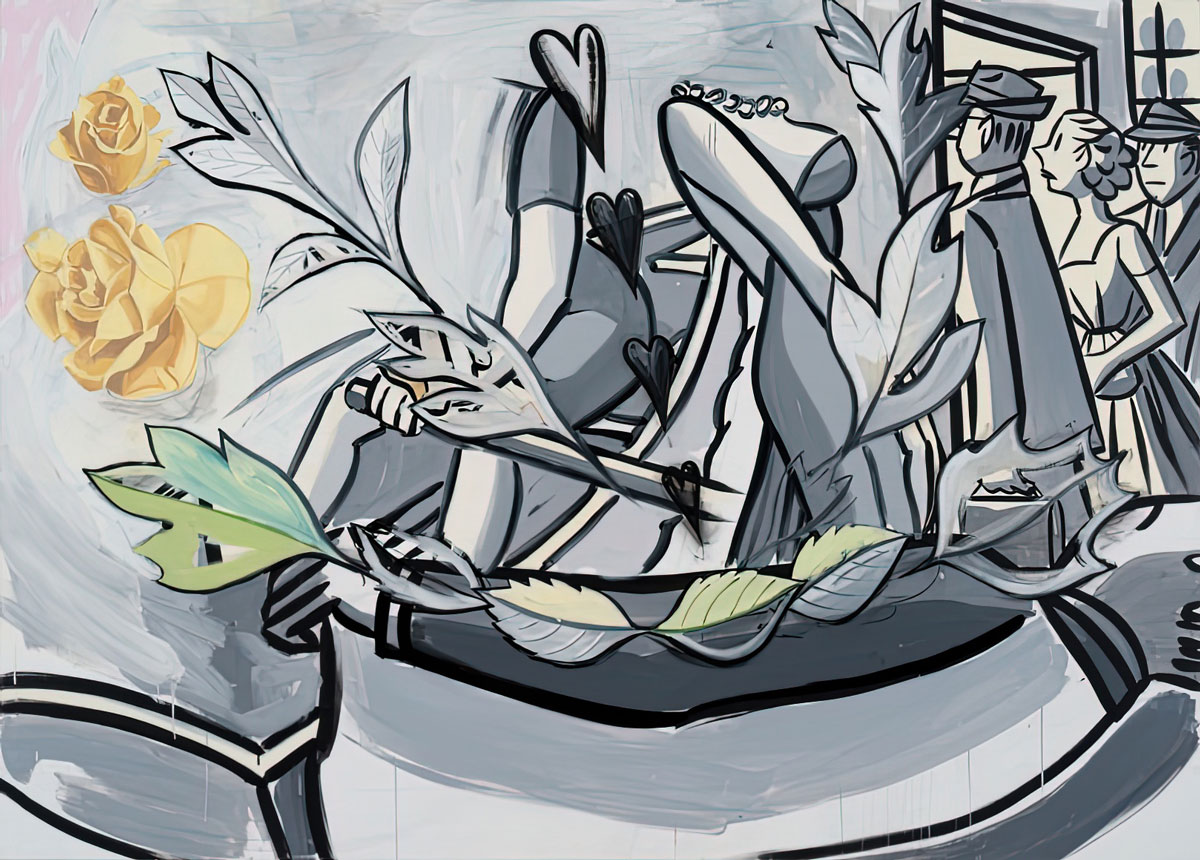 Photo: David Salle, Love and Friendship, 2019, Oil, acrylic, and charcoal on linen, 60 x 84 inches (152.4 x 213.4 cm), © David Salle / ARS, New York 2022; Photo by John Berens
