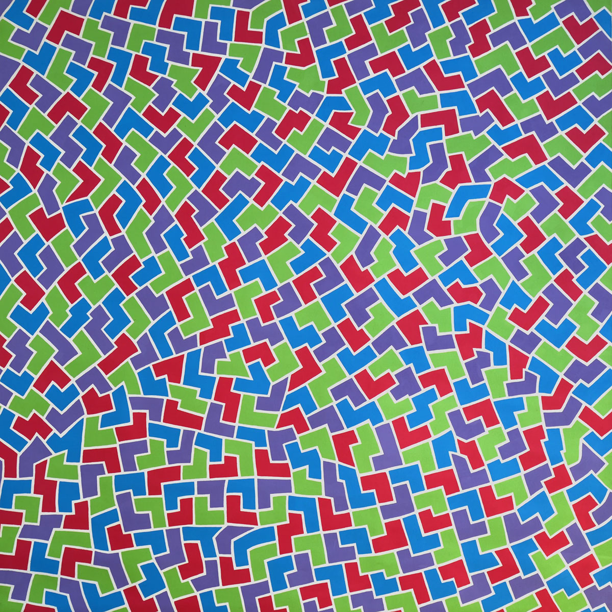 The exhibition “Paintings 1964-1966” features five paintings by Rosemarie Castoro, an artist who worked across painting, sculpture, dance, photography, graphic design, and poetry. The works included in the exhibition reflect Castoro’s primary formal interests of the mid-1960s which art historian Tanya Barson has described as the exploration of, “simple and direct compositions of bold, flat, shapes isolated on an unmodulated ground. The serial permutations of paintings, such as “Red Blue Green Purple” (1964), can be viewed as abstract forms or signs with a choreographic orientation that are articulated in infinitely repeated patterns. Castoro, like Donald Judd, rejected the oversimplification of an artist’s work into categories. Instead, she worked across mediums while maintaining a lifelong commitment to abstraction. Born in Brooklyn, Rosemarie Castoro lived and worked in New York her entire life, becoming a central figure in the city’s Minimalist and Conceptualist Art scene. Finding early inspiration in experimental dance and choreography while a student at the Pratt Institute, Brooklyn, and in subsequent collaborations with Minimal dancer Yvonne Rainer in the 1960s, Castoro’s work throughout her life exhibited a distinctly performative character and understanding of space and movement. From 1964 onwards, Castoro created systematic works exploring color and structural compositions in highly innovative experimentations, like her Y-Unit, Interference and ‘Inventory’ paintings and drawings. In 1968, a time of political unrest in the USA, Castoro abandoned color and started to engage with Concept Art, Street Works, Concrete Poetry and Post-Minimal sculpture. From the 1970s until the last years of her life, Castoro focused on sculptural experimentation. She introduced surreal and sexual allusions into the rational and mathematical frame of Minimalism, her work’s organic shapes presenting a parallel to the experimentation of Louise Bourgeois and Eva Hesse. Throughout her life she showed a tendency to blend media – declaring herself a ‘paintersculptor’. Neither wholly Minimalist nor feminist, her work transgressed and metamorphosed into an erotically charged language. The feminist critic and curator Lucy R. Lippard later identified her as a figure who ‘subverted or overrode Minimalism on its own turf’. Her earliest mature works from 1964–65 were paintings executed on square format canvases first in painterly tessellated ‘Y’ shapes and later as geometrically rendered ‘Y’s against a monochrome ground, the minimal composition having the potential for infinite repetition (the first manifestation of a theme of infinity in Castoro’s work). The paintings are characterised by bold ‘literal’ colour in diverse, opposing or close colour contrasts, her colourism attracting the praise of painter Frank Stella. Castoro developed a friendship with the painter Agnes Martin, whose influence might be detected in these early minimal paintings through their precise execution and visible pencil drawing. As Castoro’s painting developed, she fractured the ‘Y’ shapes into bars, distributing them as an all-over pattern: either in seemingly chaotic, chance compositions; in discrete though overlapping groupings; or else graphically regimented. While the ‘Y’ figure might be seen as standing in for the body, the anthropomorphic analogy can be continued in considering the bars as either bodies or demarcations of feet. The relation of painting to dance is revealed through a consideration of bodies within space and their graphic rendition in minimal dance notation. From 1966, Castoro’s painting began to emphasise the seemingly random and irregular geometric forms created from the superimpositions or ‘interferences’ of one ‘bar’ over another. These works explore subtle and intermediate colour tonalities and close contrasts that, with their formal organisation, heighten the optical qualities of the works. Such work was included in the 1966 group exhibition Distillation curated by E. C. Goossen at the Stable and Tibor de Nagy Galleries, New York, one of two exhibitions curated by Goossen that helped to define Minimalism as a movement. Two series of paintings of the later 1960s indicate Castoro’s increasing use of systems and her move towards Conceptual art. Near-monochrome abstractions, the Inventory paintings emulate her drawing practice by employing diagonal lines to record the measurements of space or an encounter with an artist friend, as in Portrait of Sol Lewitt with Donor and Friends – Oct 3, 1968. Another complementary series are her prismacolor works executed in pen through which Castoro built up surfaces of densely repeated lines. The importance of line, implicit in the visible under-drawing of her earlier works, comes to the fore in these paintings. For a little more than two years, Castoro departed from painting and produced conceptual art in a diverse range of other media, including performance art actions enacted in both street and studio, concrete poetry and installation art. These works reveal the intersection of a concern with time and space in her work. This period also saw her involvement in activism through the Art Workers’ Coalition, which met in her studio at 151 Spring Street. Despite this political engagement, Castoro rejected becoming closely involved in feminism, which she saw as restrictive and a form of ‘segregation’. She also created a series of ‘stopwatch’ works recording her everyday routines and the duration of each task, exhibiting an obsessive attention to time. In 1970, Castoro developed freestanding panels that occupied the space of the spectator. The surfaces were created from gesso applied with a broom and then covered in graphite hatching so that the works combine painting, sculpture and drawing. Castoro’s statement ‘my panels are my containers’ makes clear their relation to the body. These works are f