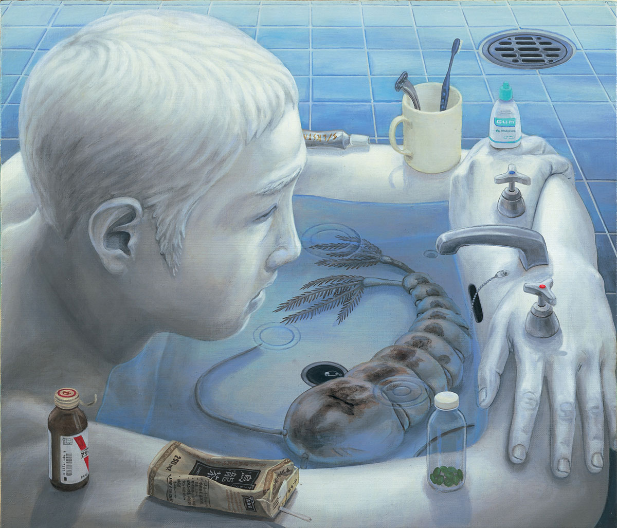 Ishida produced a total of 217 paintings during his lifetime, many of which were not discovered until years later. Often depicting identical-looking students and white-collar “salarymen” fused with machines, buildings, and consumer products, they convey a sense of foreboding and desperation emphasized by a subdued palette of blues and grays. The unsettling disfigurements endured by his subjects allegorize the pressures placed on Japanese citizens by their country’s changing identity, and by the myriad challenges of integrating new technologies into existing social and professional structures. “My Anxious Self” is divided into five thematic parts, each of which occupies a separate room in Gagosian gallery. “Waiting for a Chance” explores ideas of estrangement and the loss of self through images of assembly lines and regimented worker-consumers. Many of the paintings in this grouping also depict people fused with or partially transformed into machines: “Interview” (1998), for example, reimagines a trio of interviewers as enormous microscopes preparing to examine a hapless candidate. Another section, “Helpless Metamorphoses” features works portraying human bodies comingled with animals or objects, strongly recalling the oneiric themes of Surrealism but augmenting that movement’s rangy probing of the unconscious psyche with a social critique specific to Ishida’s millennial time and place. “Desperately Lonely” focuses on scenes of solitude and isolation set in built interiors that are often also being invaded by nature or merging in other ways with the outside world. In “Plant-Eating Dragon” (2004), for example, a curled-up man surrounded by drug paraphernalia wraps himself in a blanket that takes the form of a grassy field dotted with trees and crisscrossed by dirt paths. Another section, “Neo-Tokyo” concentrates on cityscapes and urban exteriors, additionally featuring source materials for Ishida’s work such as movies, news broadcasts, and the artist’s favorite manga and anime. Finally, “Restless Dream” comprises paintings dominated by haunting images of maternity and childhood, dreams and death. In “Characters” (2003), a naked figure (as ever, it could be the artist’s own) lies on a white bed surrounded by falling leaves. Within his body, four progressively smaller and paler versions are nested, matryoshka style, the smallest one sitting up as if ready to take its leave.