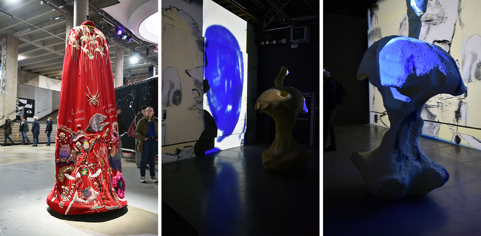 Photo Left: Dalila Dalléas Bouzar, Vaisseau infini, Installation view Palais de Tokyo, 2023-24, Photo: © & Courtesy Dimitris Lempesis. Photo Center & Right: Il morso delle termiti Installation view Palais de Tokyo, 2023-24, Photo: © & Courtesy Dimitris Lempesis