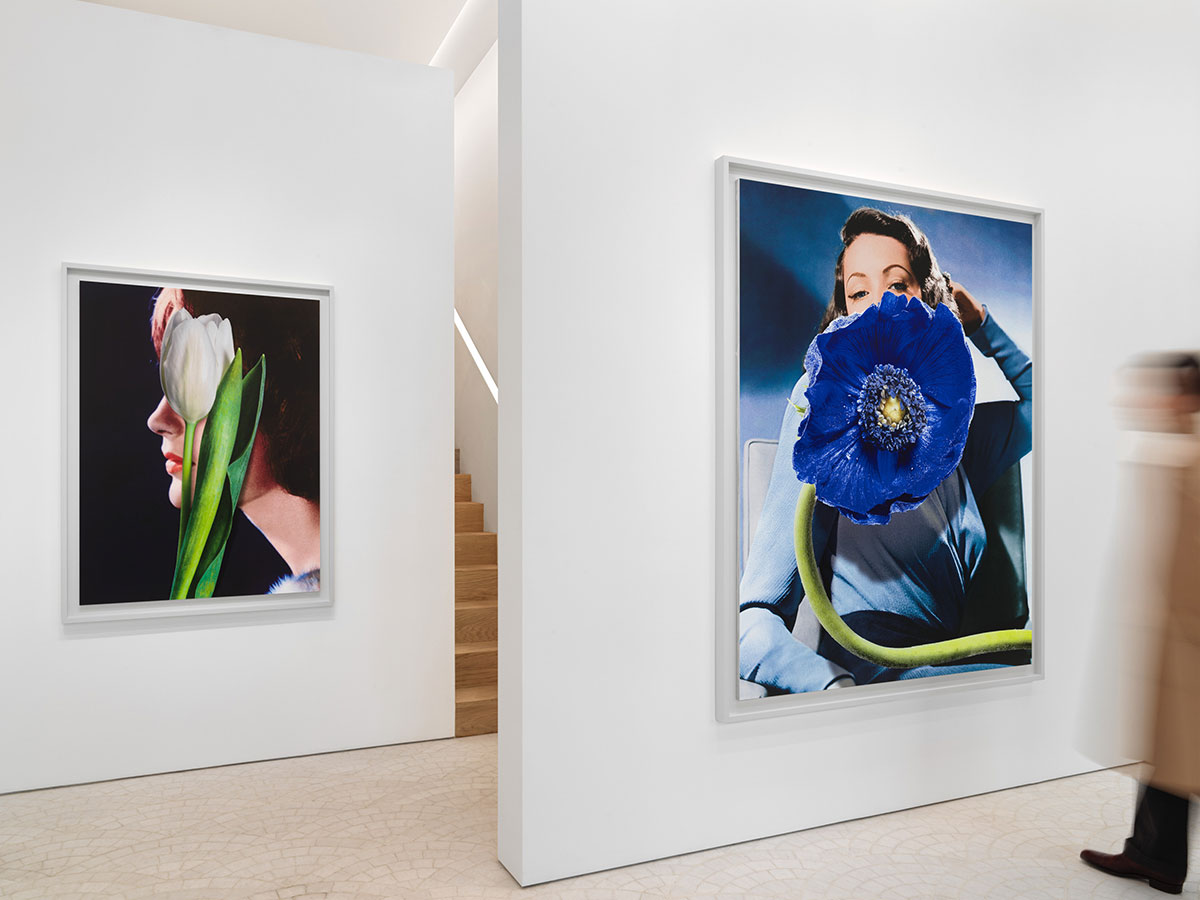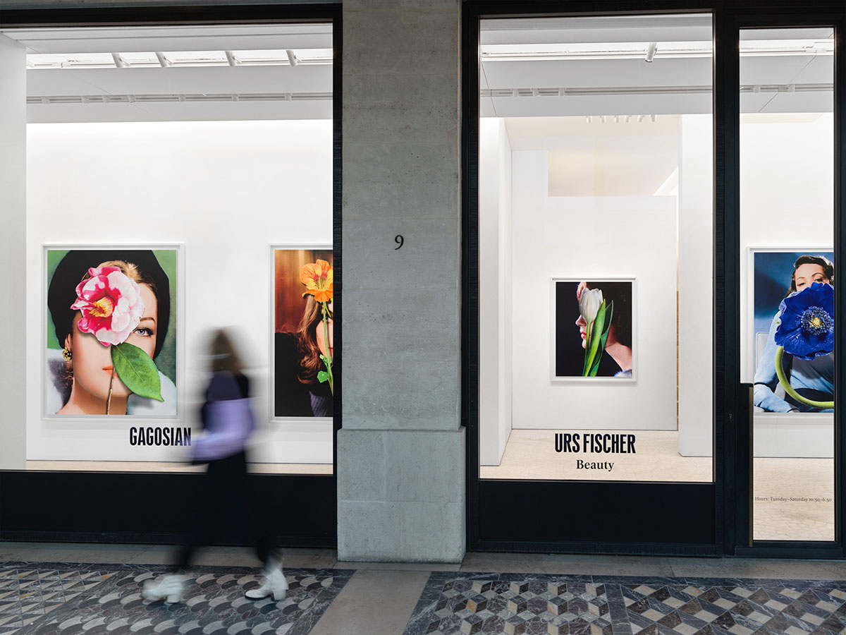 Urs Fischer’s solo exhibition “Beauty” that shows new works from his series “problem Paintings” (2010- ), follows the fall 2023 presentation of Fischer’s public sculpture Wave (2018) at Place Vendôme, and the coincident display of his painting Candyfloss (2023) in the street-facing vitrine at Gagosian gallery. Marshaling a dizzying variety of materials and methods both established and unconventional, Fischer explores themes of perception and representation, distorting scale and reimagining common objects and images through technological intervention. By evoking and reworking historical genres and motifs, he embraces transformation and decay, producing art that inhabits a space between the real and the imagined. The Problem Paintings series represents a conscious flattening out and forcing together of disparate categories and associations, calling the status and relationship of each image’s components into question. While earlier “Problem Paintings” foreground food and manufactured objects, the paintings on view in Paris feature enlarged vintage publicity headshots of popular film actors Jeanne Moreau, Romy Schneider, and Gene Tierney, partially obscured by silkscreened images of flowers. The subjects’ eyes gleam with mystery, while the vibrant colors of the blooms reflect the women’s enigmatic hidden depths. Fischer’s witty clash of images summons the romantic and sexual associations of flowers while hinting at the ephemeral character of glamour and fame; it also evokes the mustache that Marcel Duchamp penciled onto a postcard reproduction of the Mona Lisa in “L.H.O.O.Q.” or “La Joconde” (1919).The tense face-off between obfuscation and potential enacted by the works on view gives rise to the formal “problems” referenced in their collective title, while the masking of their subjects’ facial features hints at psychic and conceptual erasure. The blooms evoke floriography (the use of flowers as a coded poetic language), their pink, white, and blue colors echoing the symbolic colors of the “Tricolore”. And while their large scale suggests power and strength, they also serve as a metaphor for the women’s emergence into the sometimes harsh light of fame. Born in 1973, Urs Fischer began his artistic career studying photography at the Schule für Gestaltung in Zurich. He later lived in London and Los Angeles, and shared a studio with Rudolf Stingel in both Berlin and New York. Themes of absence and presence, as well as the processes of art production, pervade his work, in which Fischer makes use of tables, chairs, shadows, and light to explore distortion and anthropomorphism. In “Stuhl mit” (1995–2001), bulbous, fabric-covered legs merge with a wooden chair, and in “Studies for chairs for individual seating positions” (1993), the absence of a human body is suggested by a sawdust and rubber mold draped over the furniture. Food is also a major element in Fischer’s work. Rotting, melting, and crumbling, and placed in juxtaposition with permanent materials like metal, bricks, and mortar, it serves as a memento mori. “Rotten Foundation” (1998) comprises a brick structure built on a foundation of spoiling produce; “Untitled (Bread House)” (2004–05), a Swiss chalet constructed from loaves of bread, was left to be eaten by parakeets; and in the “Problem Paintings” (2010–), portraits on aluminum panels are obscured by images of eggs, peppers, and kiwis, as well as twisted bolts and half-smoked cigarettes. In 2009 Fischer presented “Marguerite de Ponty” at the New Museum in New York—his first large-scale solo exhibition in an American museum, which featured a series of immersive installations and hallucinatory environments including mirrored labyrinths and uncannily wallpapered rooms. At the Venice Biennale in 2011, his wax copy of Giambologna’s late-16th century sculpture “Rape of the Sabine Women” slowly melted, looming over additional candles depicting an office chair and a man wearing glasses and a sport coat. The candle works, which Fischer has produced since 2001, attest to his mastery of entropy, as well as his simultaneous incorporation and rejection of tradition.
