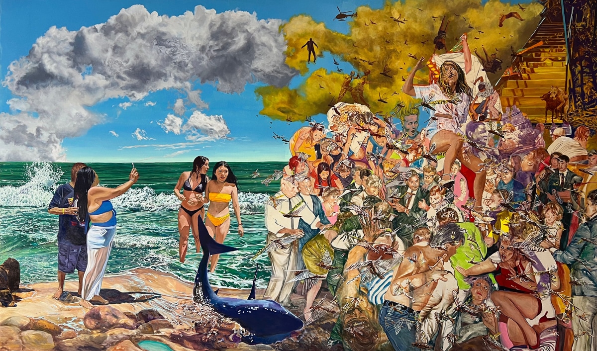 John Valadez’s work has come to define an iconography of Chicano experience in the city by catalyzing its changing dynamics and reconstructing a mythical allegory that speaks to an alternate vision. Through a multidisciplinary practice spanning 45 years, encompassing documentary photography and portraiture, public murals, paintings, and pastel works, Valadez has cultivated a style that transcends genre designations. His work evokes a fluidity between multiple cultures and visual lexicons, effectively mirroring the unsettled experience of the Chicano identity. Valadez continues to pursue politically engaged work, a persistent voice championing generations of Chicano and Latinx communities. John Valadez in his solo exhibition “Chaos Anime” presents new paintings that address the shifting global dynamics and social climates facing new generations of Chicanos today, alongside recent works that revisit earlier themes. Together, the works exhibit the breadth of the artist’s social commentaries and further contextualize his lauded approach to painting. Drawing from current events, cultural histories, city life, and such experiences filtered through lucid dreaming, Valadez implements realism, mannerism, abstraction, and montage as a vehicle for allegory and satire to ignite a myriad of socio-political conversations. Themes of invisible borders, sublime skies, and tempestuous seas, and juxtapositions between reality and dreams and the natural world versus the consequences of human interferences, are but some of the constants throughout the trove of Valadez’s urban proverbs. A pivotal moment in Valadez’s new body of work is his extension of Chicano Movement principles, speaking to global matters of displacement, gentrification, economic disparities, famine, the environment, and geopolitics. The exhibition’s title work, “Chaos” (2024) is a new mural-scaled painting that dismantles the binaries and clichés of “haves and have-nots” narratives. Compositionally split in two, the work is Valadez’s read on today’s state of the union, a horror vacui of crises weighing social violence, environmental, and economic issues. The allegory presents new perspectives on borders and speaks to new generations of Chicanos making reverse migrations from the US to Mexico in hopes of improved cultural connections and quality of life. “Shipwreck Cruise” (2024) presents a critique of tourism’s effect on locals and their environments. Against a tranquil open sea, suspended in the aftermath of an event we are left to imagine, an acidic skyline of yellows disrupts the sea and sky in a haze indistinguishable from sunrise, sunset, or pollution. The mysterious scene presents a conceptual background for us to locate our complicities, empathies, and apathies, and follow the lead of the basket-donning woman at the helm of the ship, looking to the horizon for new solutions. Other recent works, “Bambi Negra” (2018) and “Piernas Anime” (2017), exemplify different approaches to Valadez’s wry satire, where it is not always extended outward but also takes criticality inward, including self- reflection in the case of “Bambi Negra”, depicting one of his dreams, and the cultural ruminations of “Piernas Anime”, influenced by the many layers of gender dynamics of Southern California car show culture. “Piernas Anime”, translated as “anime legs,” exemplifies an alloy of Valadez’s influences from the futurism aesthetics present in Japanese Anime, to mannerism and surrealism. The painting presents a tableau that subverts the male gaze and machismo hierarchies of classic car shows. With symbols, figures, and activities occurring in the foreground and background, the paintings resist hierarchies and contain multiple entry points. The works in the exhibitioj mark an exciting moment in Valadez’s career. Radical and indefatigable, Valadez’s allegories, cutting satire, masterful color, and playful yet dead-panned pastiche bring a refreshed sensibility of endurance despite the capriciousness of time.