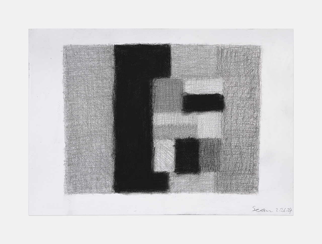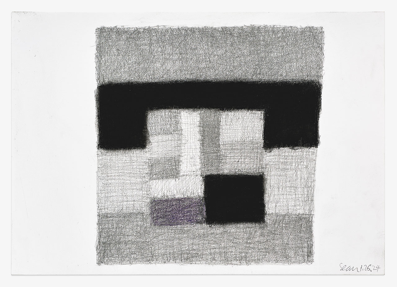“Carbon and Air” is an exhibition of Sean Scully’s rarely exhibited works on paper. Bringing together works produced within the past year with historical drawings dating from the 1960s to the 1980s, the exhibition spans rare figurative works as well as testifying to the evolution of some of the artist’s best-known abstract series, “Wall of Light” and “Landline”. In 2023, Scully began a new series of works in which he reimagines some of the most recognizable compositional motifs of his paintings in pencil on paper. From the densely arranged rectangular forms found in his “Wall of Light” series to the stacked horizontal structures of his “Landline” works, these familiar shapes, which are always rooted in the forms he finds in the real world, reemerge in the exhibition through intricate, meditative hatching and shading. One of the first artists to break free of the rigidity of Minimalism, Scully led the transition to a more emotional, impassioned form of abstraction, in which composition is defined by his acutely experienced impressions of the world around him. As such, the recent drawings on view are each named after the date of their making. Though known for his use of color, monochrome also holds an important place in Scully’s palette. Born in Dublin, Ireland, his family moved when he was four years old to the grey, industrial outskirts of London. In 1975, when he arrived in New York, he began what he has called a ‘five-year love affair with Minimalism’, inspired by the city to reduce his palette back down to these same monochromes in his ‘Black paintings’. The pencil drawings on view serve as a reminder of the artist’s relationship to high Minimalism through their formal self-sufficiency, while demonstrating Scully’s masterly ability to convey light in black and white through meticulous shading, creating, as Dávid Fehér, curator of the exhibition at the Hungarian National Gallery, writes, ‘color without color’. Like in the drawings of Georges Seurat, an important reference for Scully, densely filled space contrasts with sparser areas in which the individual strokes of his pencil are visible to form compositional structures guided by tone rather than line. The remarkable range he finds within monochrome, meanwhile, is profoundly influenced by the force of ‘the dialectical, or the grey’ in Giorgio Morandi’s work. In some of the drawings on view, the subtle application of blue, purple or red pencil introduces touches of color. Scully has been working with the geometric grids and blocks that are the ancestors of the works on view since the late 1960s while still a student at Newcastle University in England. However, the exhibition also presents a small selection of figurative drawings from the early 1960s – before the artist entered art school and while he was still working as a typesetter’s apprentice – in which can be found the same attunement to light and dark, portrayed through shading rather than through color, as is found in the artist’s mature and abstract compositions. In one 1964 work, a pensive figure emerges from a somber ground created through the application of heavy pencil strokes, the physicality of which is palpable in the finished work. In another drawing from the same decade, delicate, swirling shading forms shadows on the floor in a sun-bathed domestic scene. Drawing has accompanied Scully’s practice as a painter since the beginning of his career, and his works on paper, as Joanna Kleinberg and Brett Littman, curators of the itinerant 2012–13 survey of Scully’s drawings which concluded at The Drawing Center, New York, wrote, ‘both paraphrase and diversify the ideas in his canvases’. Conceived as a development or extension of existing motifs – as ‘stripping the motifs bare’, as Dávid Fehér writes – rather than as studies or preliminary sketches for his paintings, the artist’s drawings turn the often-implied hierarchical relationship between the two mediums on its head. Harnessing the intimacy of drawing, Scully brings his familiar typologies of work to their purest conclusion to portray the essence at the heart of the compositions he returns to again and again.