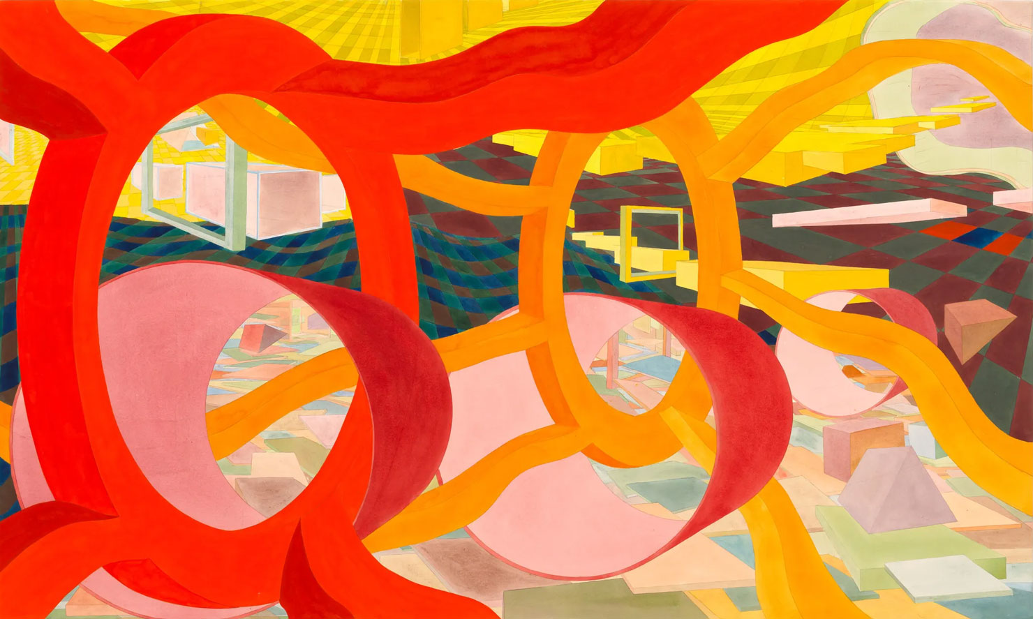 The exhibition “About Space” surveys the trailblazing practice of American painter Al Held (1928–2005). With roots in Abstract Expressionism, Held sought and realised novel modes of form, space and color, navigating spatial complexity through a combination of hard-edged geometry and spontaneous gestural expression. This exhibition unveils masterworks from seminal series spanning the artist’s career – from the vibrant expanses of his “Taxi Cab” paintings (1959–60) to the hyper-real spaces of the “Luminous Constructs” (1985–2005). During the late 1950s, gestural painting was something that Held had begun to lose interest in. He and a few other artists such as Morris Louis and Kenneth Noland felt a growing problem emerge. The style had brought a large number of mediocre artists and become overdone for them.[10] By 1960 he had succeeded in finding an alternative method given the label hard edge. In other ways it has been described as post-painterly abstraction, new abstraction, and cool art. The famous exhibition organizer Irving Sandler has been known to characterize it as concrete expressionism. The development of this style also led Held to change his medium from oil to a water-based acrylic. These paintings had vivid colors geometric configurations around positioned throughout the canvas resembling a mural. With these works Held takes concrete abstraction to its extreme. Around 1961-1966 Held created large abstract letters of the English alphabet. These paintings were given the titles The Big ‘N’, The Big ‘X’, etc. There is a delicate alteration of the letters as Held plays with viewers perception’s by changing the figure to the frame. The letters themselves take over the canvas and colors within the works make them seem to lean forward and backward at the same time. It leaves the viewer to think about the ideas of space and form and how dimension plays a key role. In 1967 Held felt that he was being limited by the flatness of previous hard edge abstractions. He wanted a way to create more picture space in some way, however painting shapes onto shapes would constantly hide beneath one another. Therefore, Held believed that adding depth and making the shapes appear three-dimensional on the canvas was his best option. The works “Giza Gate II” and “Flemish IV” are good examples of this style. All of these works are composed in acrylic black and white. The quasi-geometric structures zigzag in all directions making complex shapes usually cubical. Despite the same consistency of content throughout the works each maintain a unique design of their own. Grid like elements started becoming more apparent suggesting structure similar to that of the framework in buildings. The paintings are in a way disorienting with their uncentered patterns and no place to gain perspective. As his art’s complexity grew the idea of his art to be deemed minimalistic became less of a dominant label. Another remarkable characteristic of these works is the scale. While Held was away from his studio in New York during the 1980s, he created a number of watercolor paintings in Rome.The perspective of the shapes created a sense of deep space by expanding into the canvas what seems like forever. These works test imagination with intersecting planes and large to small forms jutting in the picture. Held’s visual concept of infinity creates a need for the viewer to look inward on themself. Many of Held’s modern artwork includes large symmetric non-objective structures with vivid colors. Using an acrylic medium, he created interlocking scaffolds that overlap with a deep consideration of architecture. The ancient buildings of Rome and the idea of the renaissance inspired Held as he returned to New York. Describing Held’s images as “room” or “walls” makes sense, however, the art is non-objective and those may not be the best words to use. On one hand the work has architectural qualities but at the same time the planes of color are nonrepresentational and in a way cannot be grasped.